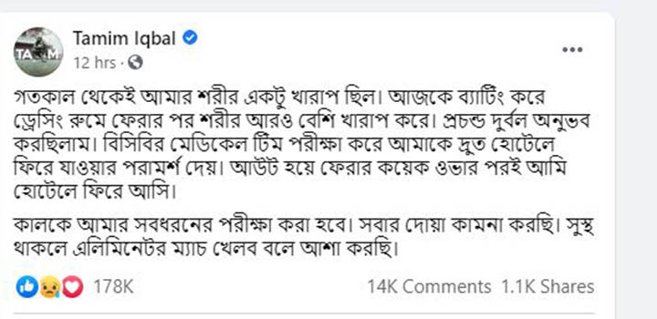 ফেসবুক পোস্টে তিনি আরো লিখেন, ‘কালকে আমার সবধরনের পরীক্ষা করা হবে। সবার দোয়া কামনা করছি। সুস্থ থাকলে এলিমিনেটর ম্যাচ খেলব বলে আশা করছি।’