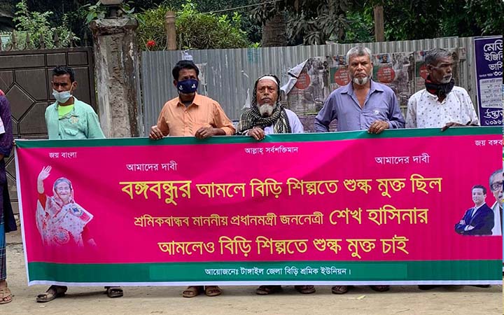 বক্তারা আরো বলেন, বিদেশী সিগারেট কোম্পানীগুলোকে একচেটিয়া ব্যবসার সুযোগ করে দিতে কতিপয় অসাধু আমলা বিড়ির উপর ষড়যন্ত্রমূলকভাবে বিড়ির মূল্য বৃদ্ধি ও মাত্রাতিরিক্ত করের বোঝা চাপিয়ে দিয়ে থাকেন। এই মাত্রাতিরিক্ত করের বোঝা সহ্য করতে না পেরে কারখানা বন্ধ করতে বাধ্য হচ্ছে। ফলে বিড়ি শ্রমিকরা কর্ম হারিয়ে অনাহারে, অর্ধাহারে দিনাতিপাত করছে। বিড়ি শিল্প ও শ্রমিকদের কর্মরক্ষার্থে বিড়ির মূল্য ১৮ টাকা থেকে নূন্যতম ২ টাকা কমিয়ে ১৬ টাকা করতে হবে। একইসাথে নিম্নস্তরের সিগারেটের মূল্য ৪০ টাকা থেকে ৫০ টাকা বৃদ্ধির জোর দাবি জানাচ্ছি।