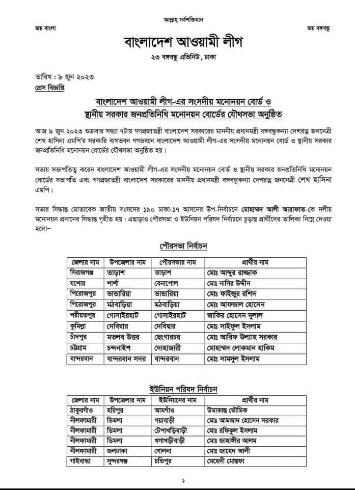 মনোনয়ন বোর্ড সভায় সভাপতিত্ব করেন দলের সভাপতি প্রধানমন্ত্রী শেখ হাসিনা। দলের দপ্তর সম্পাদক ব্যারিস্টার বিপ্লব বড়ুয়া স্বাক্ষরিত বিজ্ঞপ্তিতে এ তথ্য জানানো হয়।