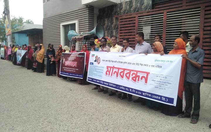 মানববন্ধনে বক্তারা বলেন, বিড়ি শিল্প দেশের প্রাচীন শ্রমঘন একটি শিল্প। এই শিল্পের ওপর ভ্যাট ও ট্যাক্স বাবদ সরকার সিগারেট এর সাথে বৈষম্য রেখে যে পাহাড় চাপিয়ে দিয়েছে সেখান থেকে বেরিয়ে এসে বিড়ি মালিকদের যেমন বিড়ি উৎপাদন দিয়ে কারখানা সচল রাখা অসম্ভব হয়ে দাড়িয়েছে তেমনি এই শিল্পের সাথে সারাদেশে জড়িত ১৮ লক্ষ হতদরিদ্র, স্বামী পরিত্যক্তা, শারীরিক বিকলাঙ্গ বিড়ি শ্রমিকদের কারখানায় কাজ করে জীবিকা নির্বাহ হয়ে পরেছে চরম শঙ্কাটাপূর্ণ। সেই সাথে এই শিল্পের তলানিতে শেষ পেরেক মারার কাজ করছে ব্রিটিশ-আমেরিকান টোব্যাকো কোম্পানি তাদের কিছু দালালদের বিড়ি উৎপাদনের নাম করে কাস্টমস এর কিছু অসাধু কর্মকর্তাদের সাথে আতাত করে লে-আউট বিহীন কারখানার নিবন্ধন পাইয়ে দিয়ে নকল/জাল বা পুনঃ ব্যবহৃত ব্যাঙ্গোল ব্যবহার করে বিড়ি উৎপাদন করে কমদামে ৫-৮ টাকা মূল্যের বিড়ি তে বাজার ছয়লাপ করে দিচ্ছে। এবং এর পাশাপাশি প্রকৃত ভ্যাট-ট্যাক্স দিয়ে বিড়ি উৎপাদনকারী বিড়ি কোম্পানি গুল্যের বিড়ি মানহীন তামাক ও কাঁচামাল দিয়ে নকল বিড়ি উৎপাদন করে বাজারজাত করার মাধ্যমে ভোক্তা পর্যায়েও চাহিদা নষ্ট করছে যার ফলস্বরূপ কোম্পানি গুলো তাদের কারখানার উৎপাদন অব্যাহত রাখতে পারছে না ফলে আমাদের শ্রমিকেরা প্রতিদিন তাদের কর্ম হারাচ্ছে। এছাড়া স্পেশাল রাজা বিড়ি, রাজা বিড়ি, বাংলা বিড়ি, নুরজাহান বিড়ি, জামাল বিড়ি, নূরমহল বিড়ি, নাহিদ বিড়ি, শ্রমিক বিড়ি সহ বিভিন্ন কোম্পানিগুলো রাজস্ব প্রদানে কোন প্রকার প্রবৃদ্ধি জায়গায় বরঞ্চ ঘাটতিতে কেউ কেউ ৪০ শতাংশ ও অতিক্রম করেছে। তারপরও জেলার রাজস্ব কর্মকর্তাগণ তাদের বিরুদ্ধে কোন প্রকার কার্যকরি প্রতিকার পদক্ষেপ নিতে নারাজ। এসব বিড়ির বিরুদ্ধে ব্যবস্থা নিতে কাস্টমস কর্মকর্তাদের নিকট অনুরোধ করছি।
